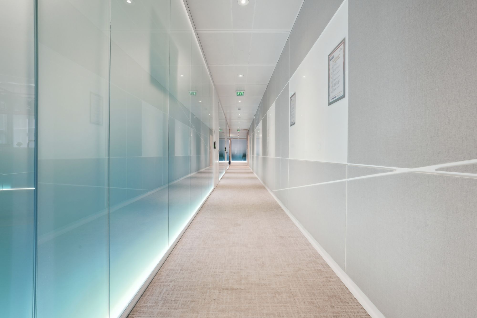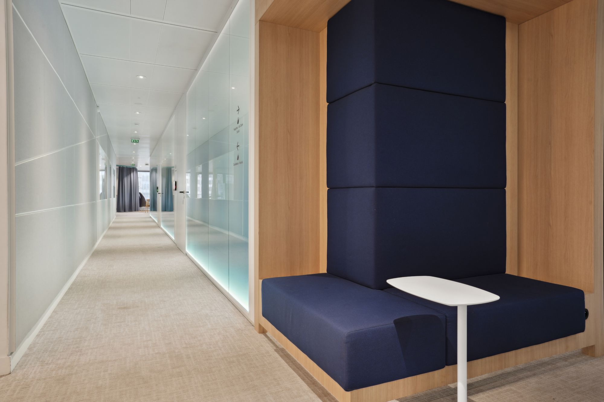 Se han integrado tiras de luz en los tabiques para escenificar la circulación y resaltar el acristalamiento de Saint-Gobain
