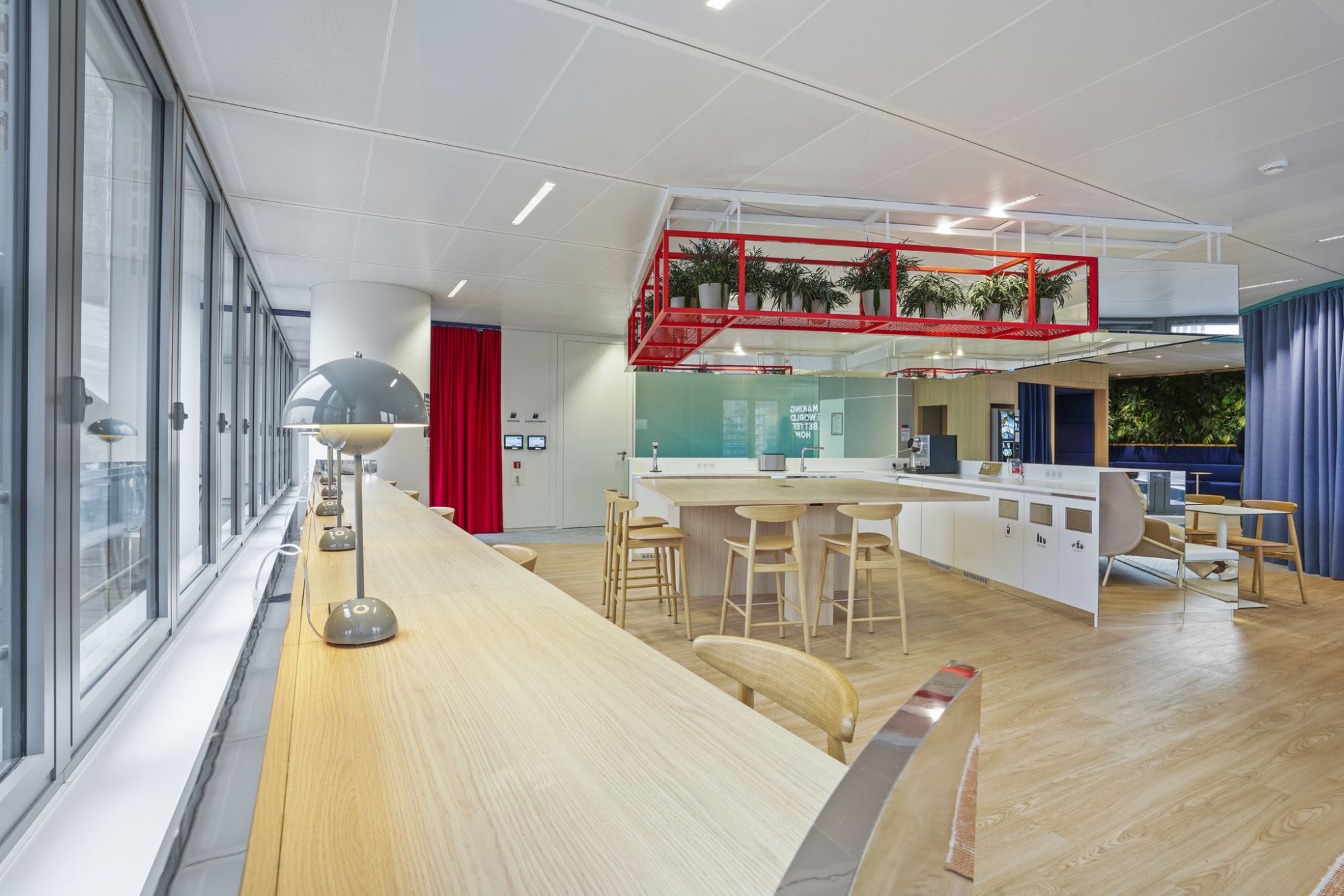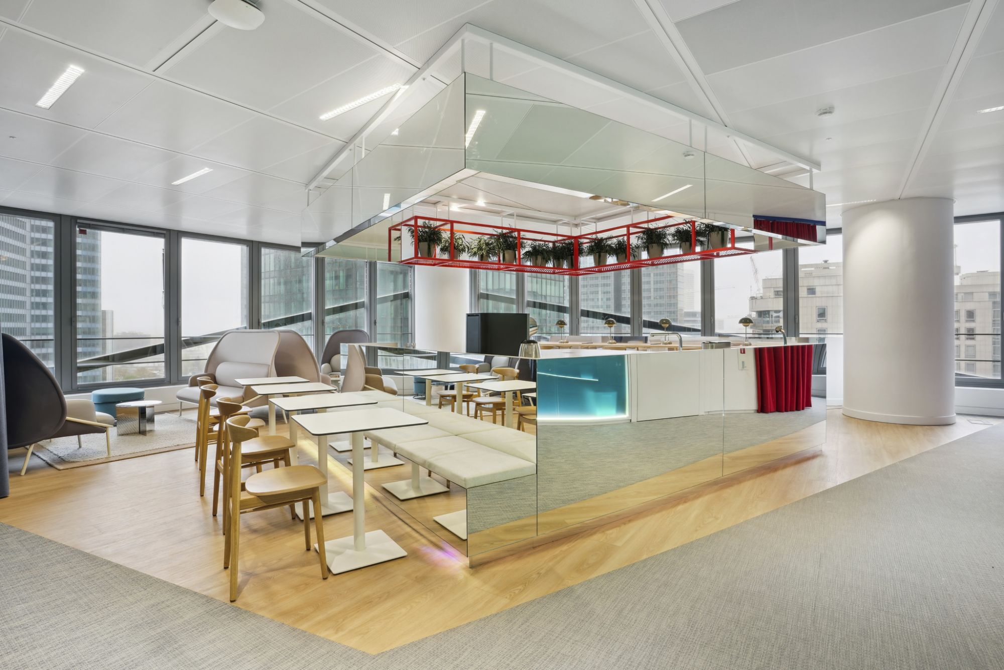 La isla del Work Café con espejos, un nexo de unión entre la sala de trabajo y los espacios de reunión