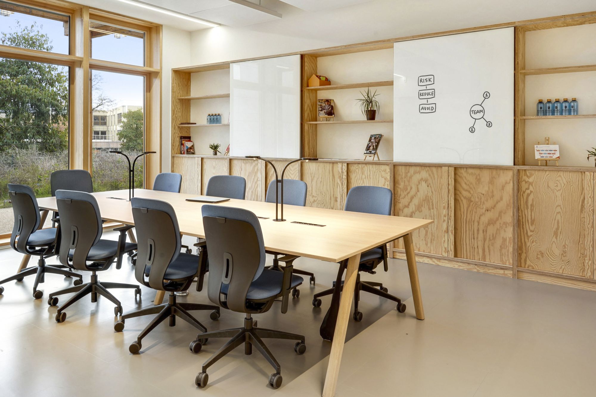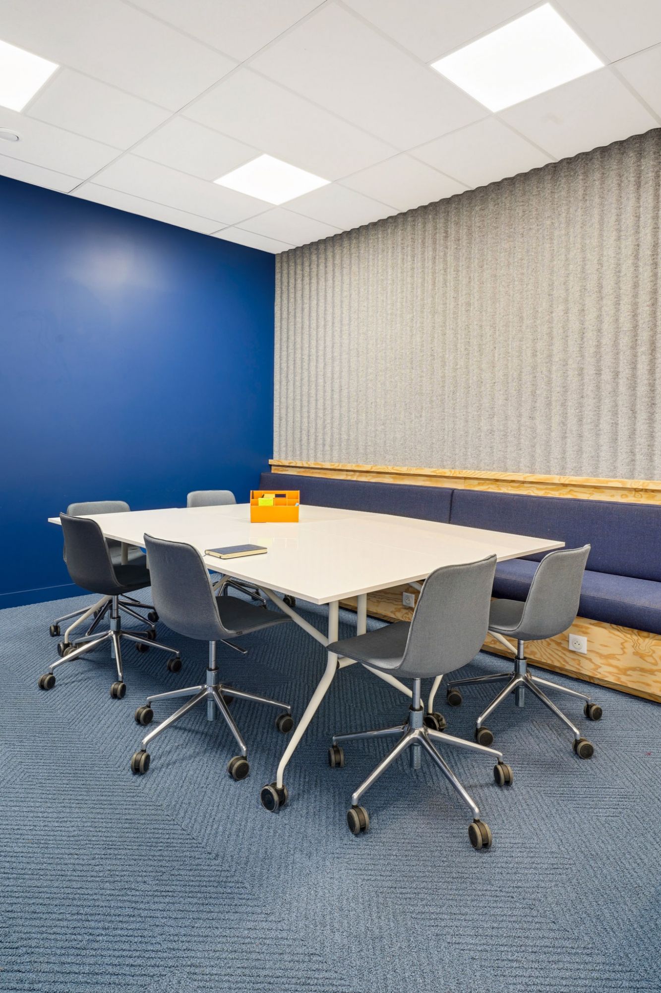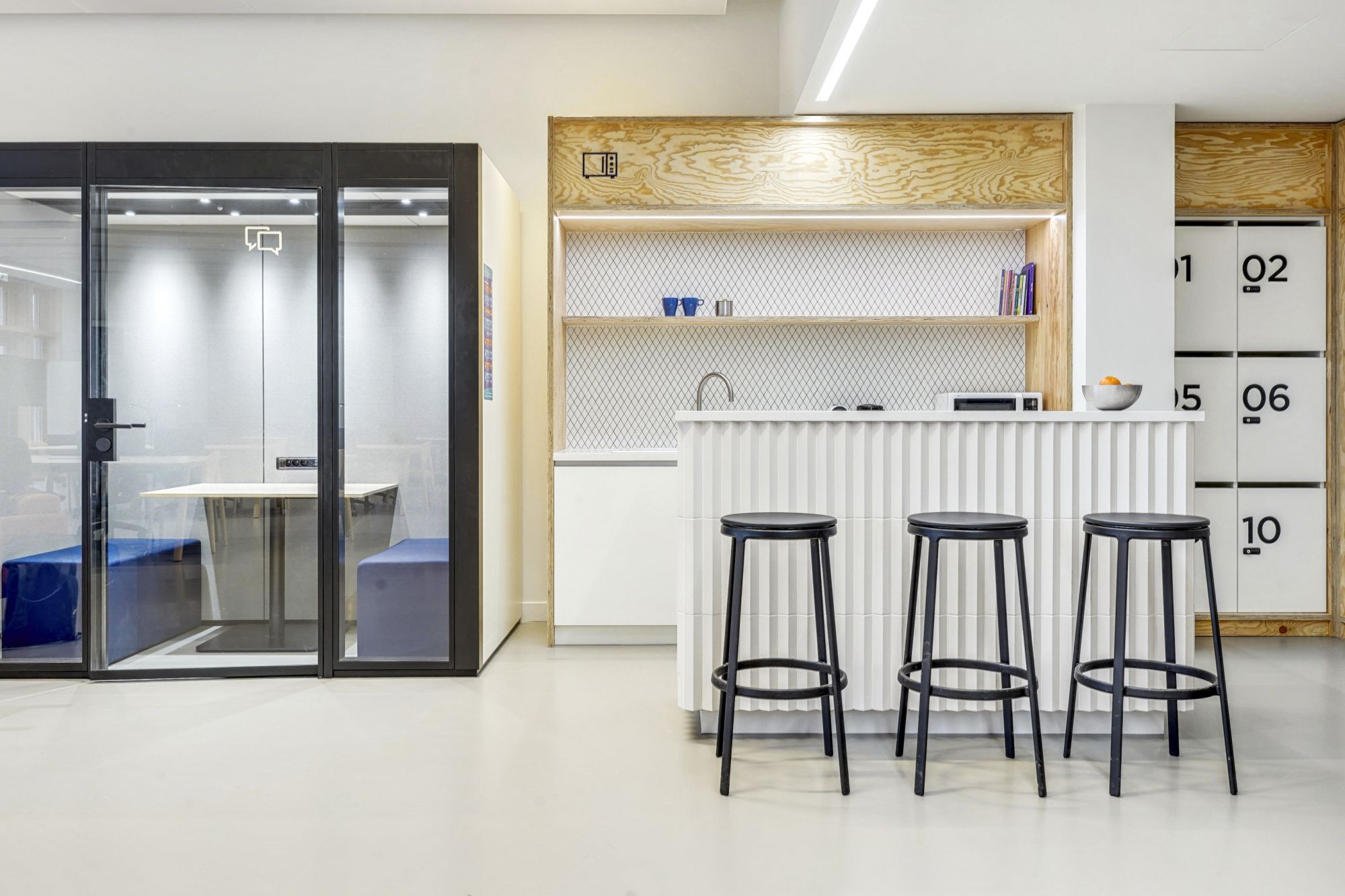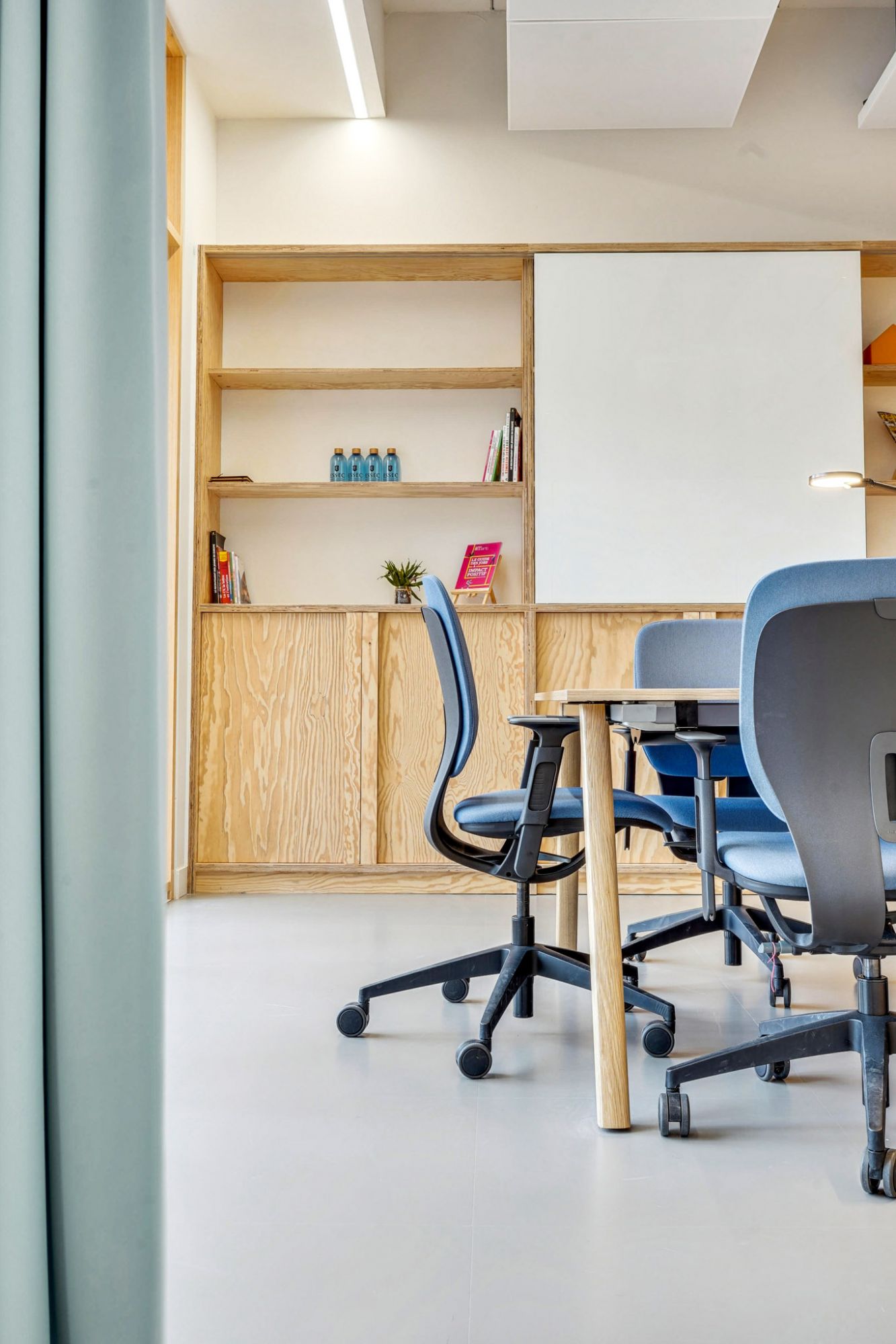Le blanc dominant est contrebalancé par des matériaux accents qui traduisent un bouillonnement créatif (tripli pin, laines colorées, panneaux écrivables, plastique recyclé).