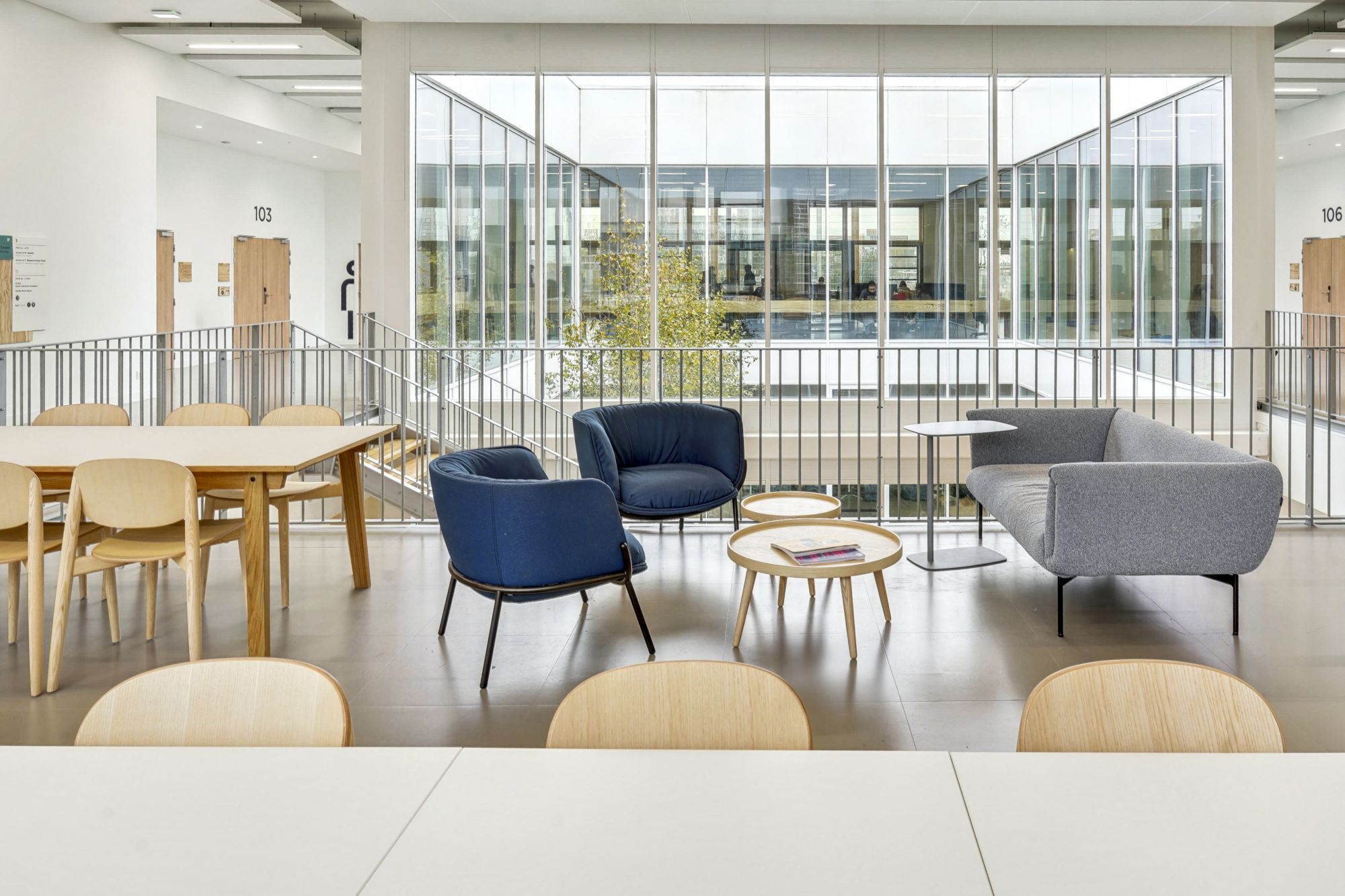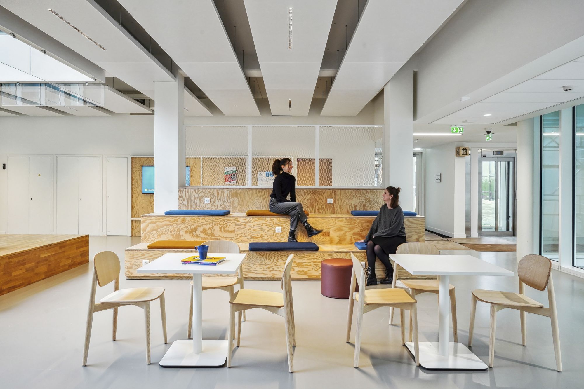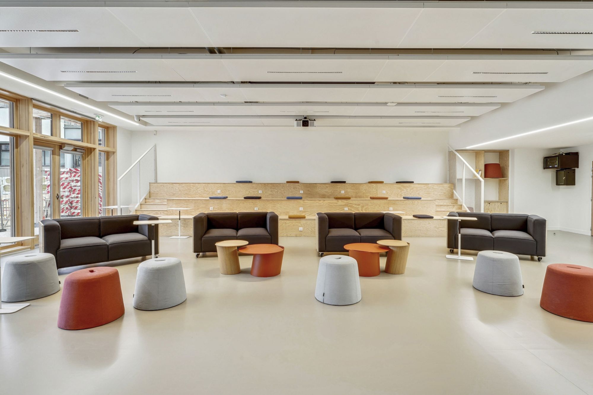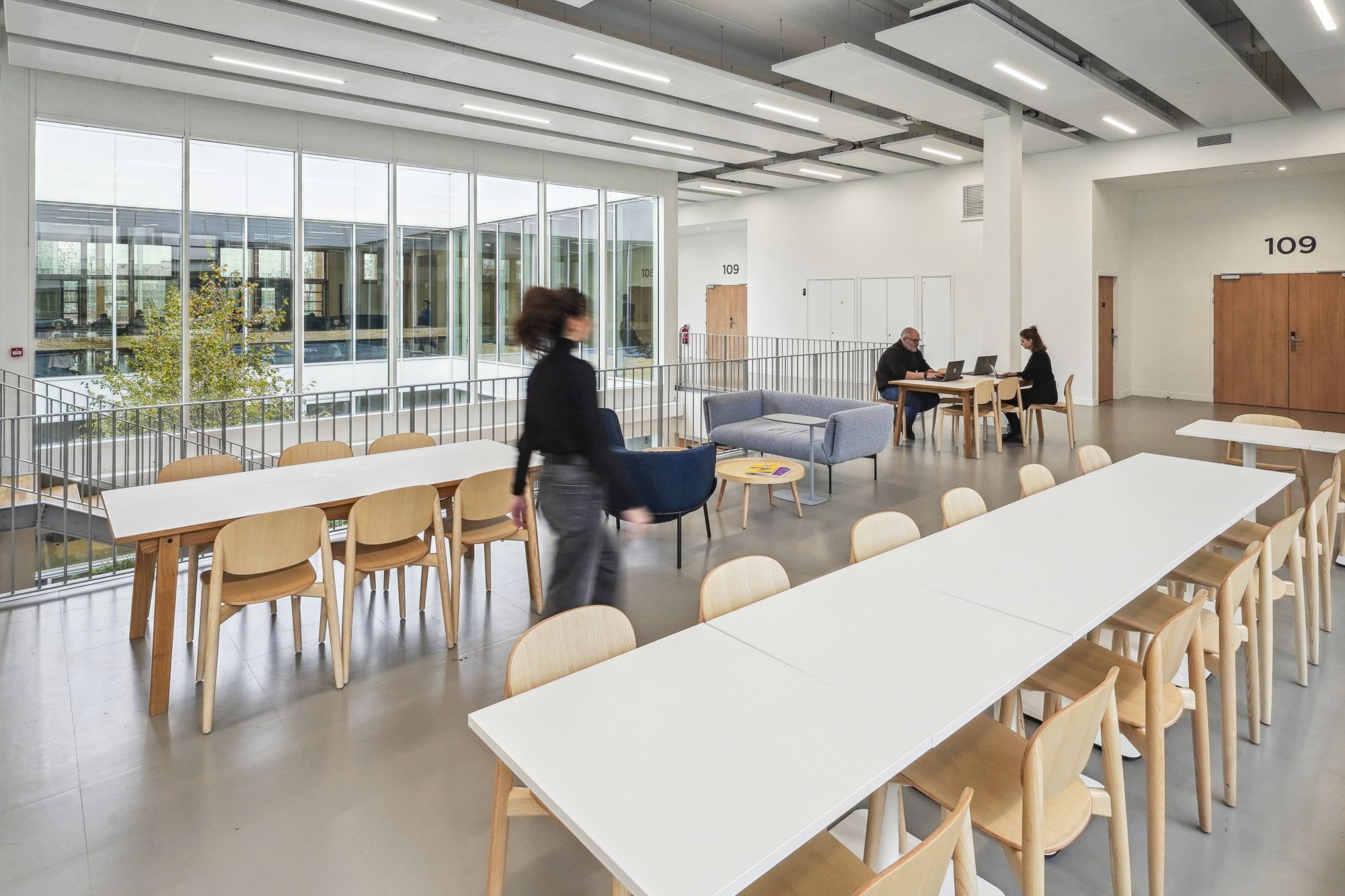 Mobiliers et matériaux viennent de chaines de productions européennes. L’architecture est centrée sur les usagers et se veut exemplaire quant aux problématiques d’inclusivité, de responsabilité sociétale et de respect de l’environnement.