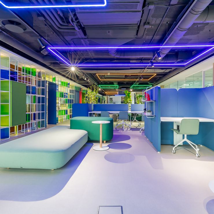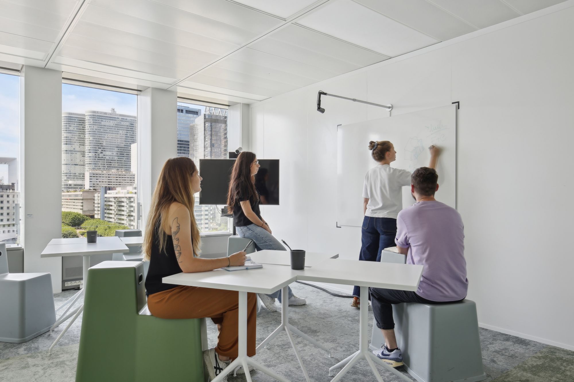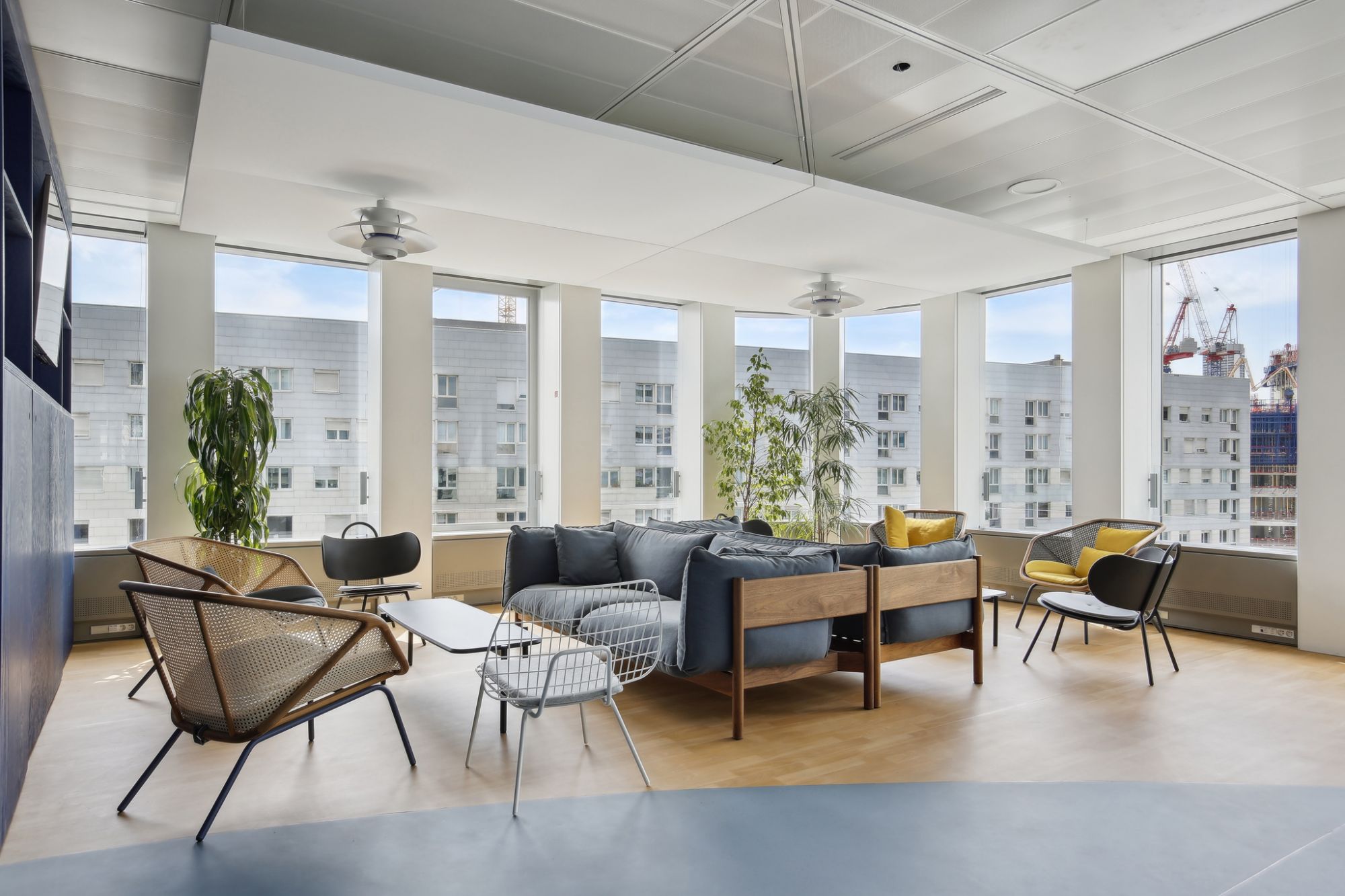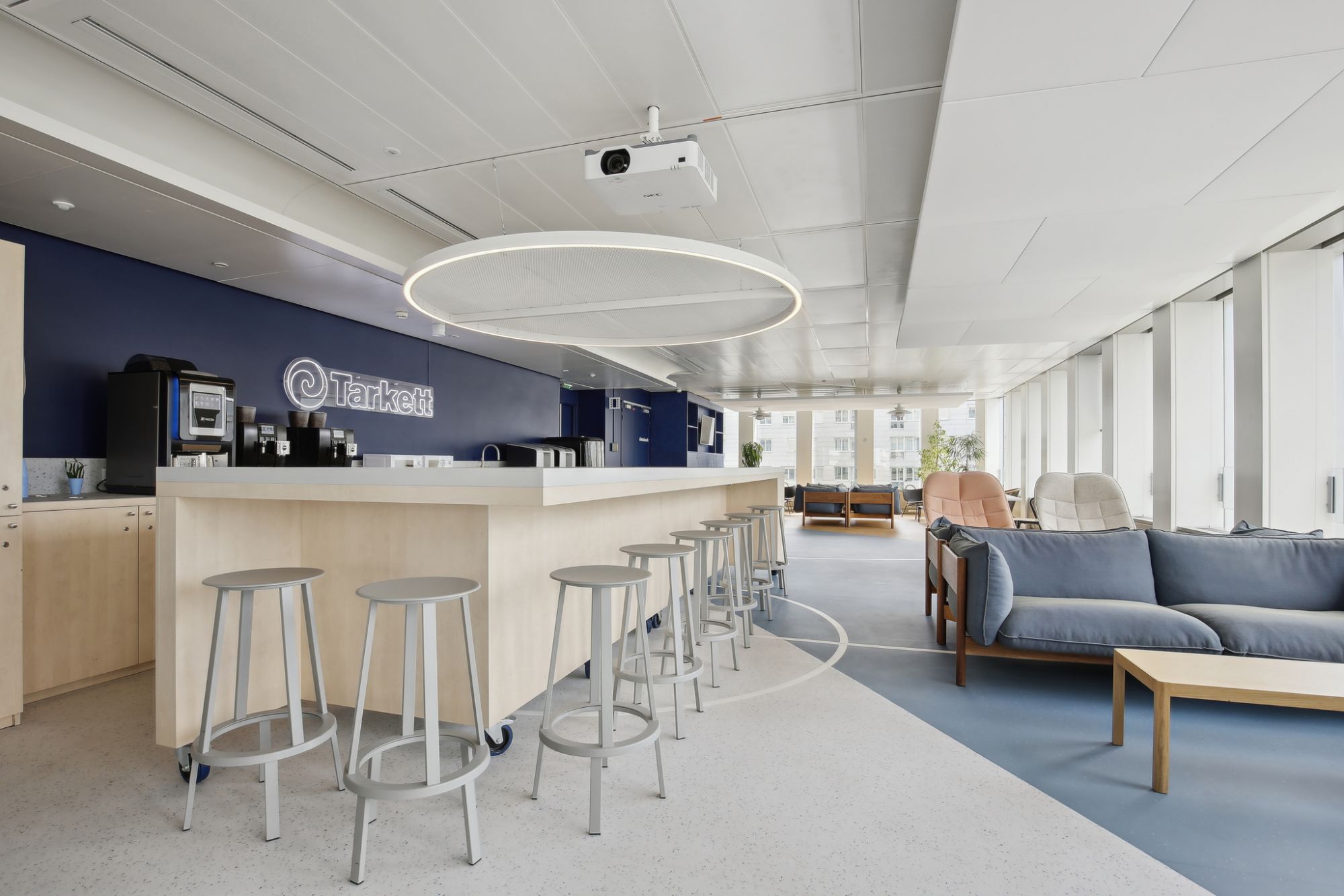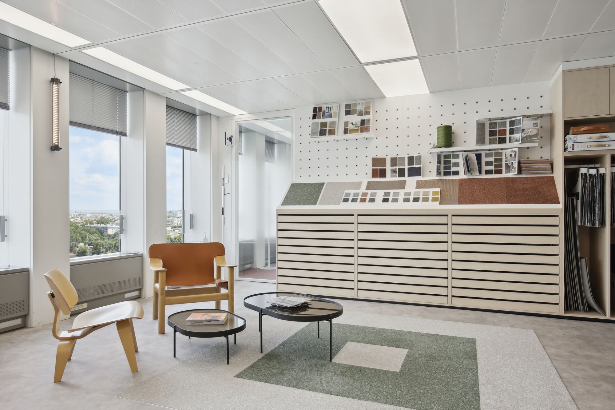 Implanté sur 7 étages dans la Tour Initiale, ce projet de 5 500 m² met en avant les matières Tarkett avec une cinquantaine de sols différents mais aussi un travail sur le détournement de la matière.