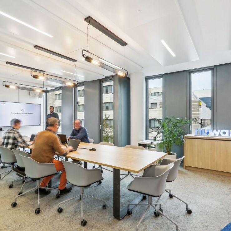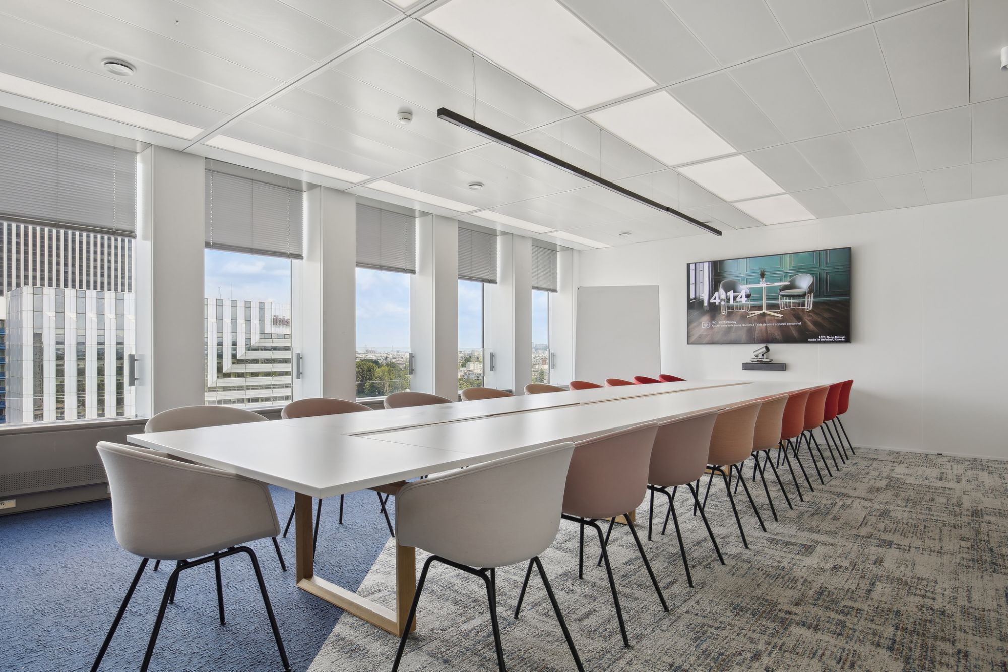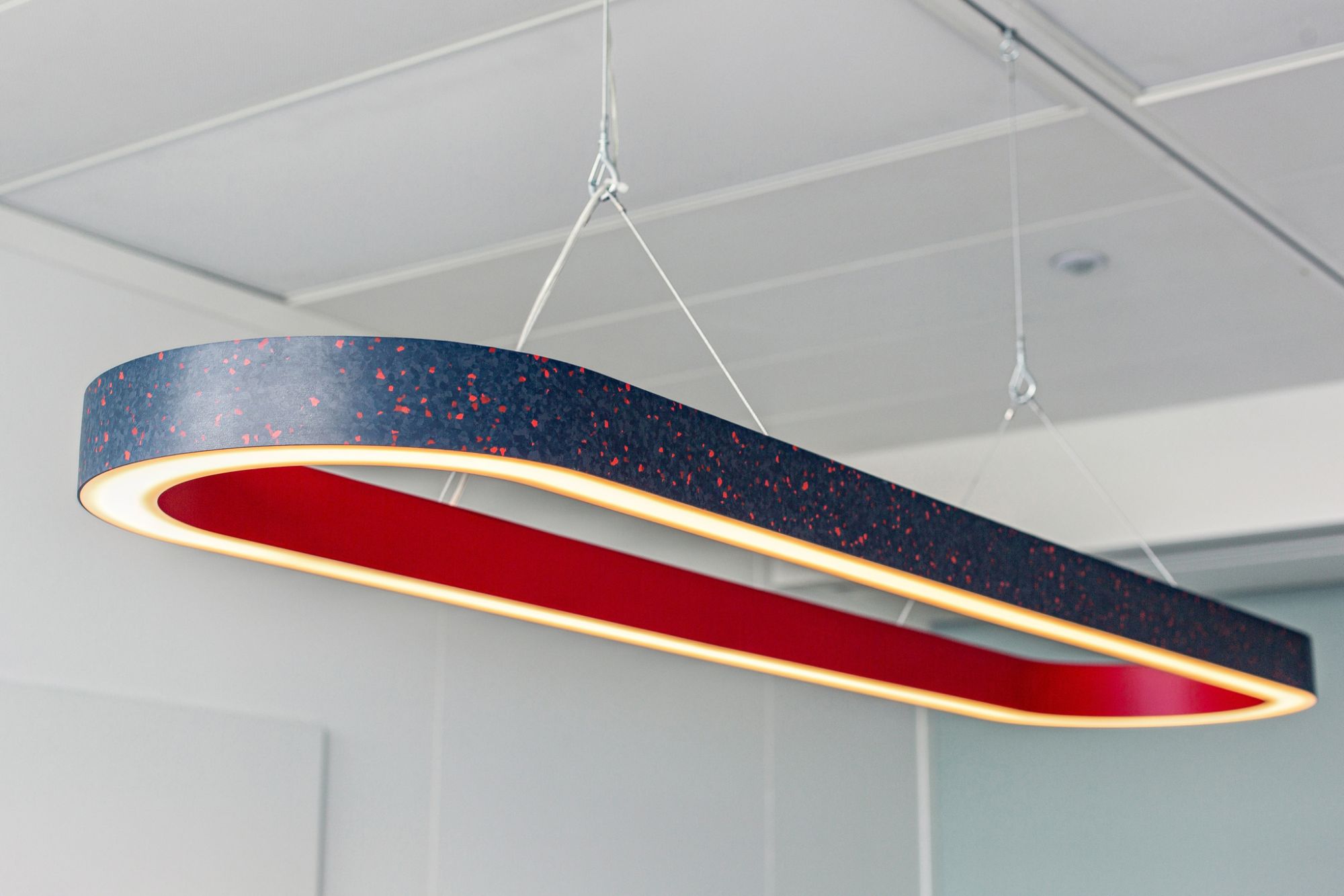De multiples agencements ont pris place dans le projet, les tables de réunions ainsi que les luminaires associés ont été imaginés et réalisés en PVC Tarkett pour illustrer le potentiel et mettre en avant leur produit.